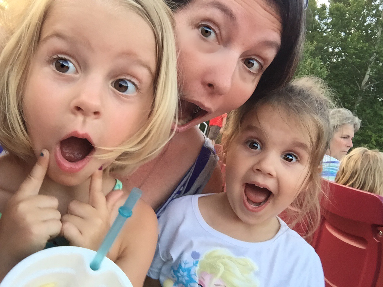 Then my sister and I took our little ones to the showing of Disney’s Frozen at the local amphitheater. My niece posed with Elsa and Anna, teenagers volunteering their time and impressive makeup and musical talent, and Olaf, the most unlucky volunteer who had to wear a snowman costume in 90 degree heat while posing for photos with preschoolers for hours. (There is a special place in heaven for Olaf for sure.) The kids had a blast. It was a great fundraiser for Children’s Miracle Network, and as we waited for darkness to fall, I thought of my girls and my illness, and wondered if the lessons I’m trying to instill in them are sticking. We watched the blue moon, which was ironically brilliantly orange, rise between the trees, and the movie finally began. Every part of me hurt. My ankles, knees, spine. I couldn’t even open my right eye. The kids lasted through “Let It Go,” and, yes, the entire stadium of euphoric little girls sang and danced in full interpretational style. By the time Elsa had let her hair down and created her castle, our kids were done, and I was secretly relieved. My entire body was screaming in pain.